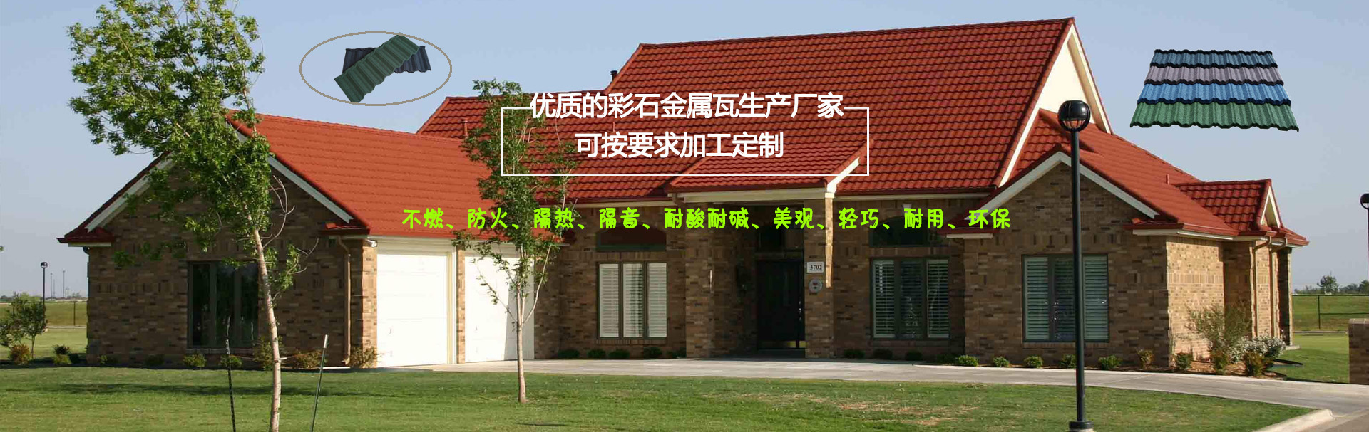 我們是一家彩石金屬瓦設備、設計、制造、銷售、安裝及服務于一體的公司 以過硬的產(chǎn)品質(zhì)量,優(yōu)惠的產(chǎn)品價格,令人滿意的銷售服務,贏得您的支持與信賴。 彩石金屬瓦以防腐性能優(yōu)異的鍍鋁鋅鋼板為基板,以耐候性強的丙烯酸樹脂為黏合劑,以彩色天然沙礫為面層的新型屋面材料。